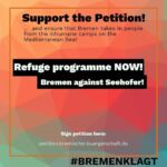 Thousands of people are forced to live under inhuman conditions. Human rights and respect do not seem to apply for them. We want Bremen to fight for a humane and respectful refugee policy. We want Bremen to take Seehofer to court for supporting the inhuman conditions at the Mediterranean Sea like the senat of Berlin did already. A successful trial would be a first but important step to fulfil the duty of a human refugee policy. Even though 100 refugees are by far not enough a trial against the home secretary would be the condition to bring ALL the refugees in danger to safety in the future. #leavenoonebehind